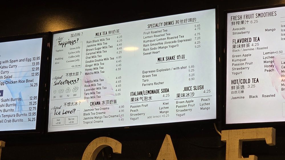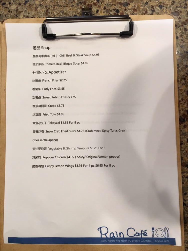 Rain Cafe, located in Seattle, offers a casual yet classy dining experience with a variety of appetizers, ramen and soup options, and rice bowls. The menu features popular dishes like Beef Noodle Soup, Chicken Katsu Curry, and Gyudon Beef Bowl. Customers appreciate the affordable prices and tasty food, with mentions of the spicy shoyu ramen and chicken katsu with curry standing out as favorites. The cafe also serves bubble tea, with flavors like honey milk and vanilla milk tea receiving praise. While some mention the ambiance as lacking warmth, the friendly staff and ample seating make it a great spot for hanging out with friends or getting work done. Overall, Rain Cafe offers a good value for delicious Asian-inspired dishes and refreshing beverages.